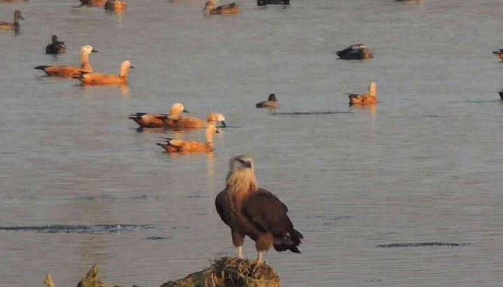 सर्दी के मौसम में आसन रामसर साइट की झील पर उड़ान भरने वाला पलाश फिश ईगल नामक पक्षी...