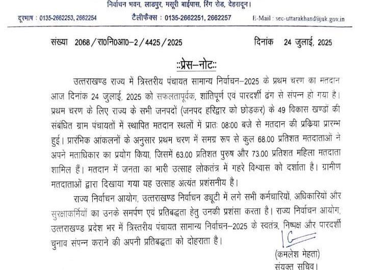 उत्तराखण्ड राज्य में त्रिस्तरीय पंचायत सामान्य निर्वाचन-2025 के प्रथम चरण का मतदान 24 जुलाई, 2025 को सफलतापूर्वक,...