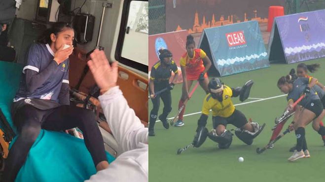 रोशनाबाद स्थित वंदना कटारिया हॉकी स्टेडियम में 38वें राष्ट्रीय खेल के तहत हॉकी मैच के दौरान कर्नाटक...